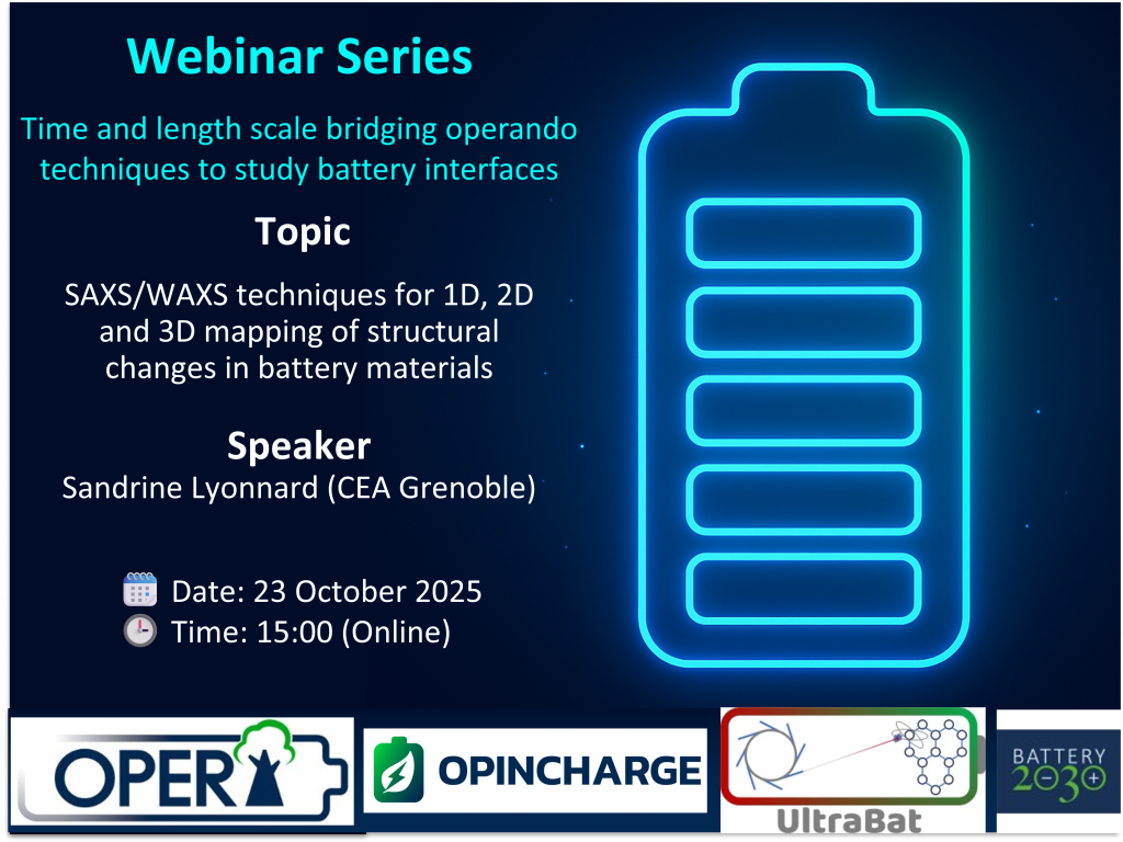 Together with our Battery2030+ sister projects OPINCHARGE and UltraBat we organised a webinar series. The first topic will be “SAXS/WAXS Techniques for 1D, 2D, and 3D Mapping of Structural Changes in Battery Materials”, presented by Sandrine Lyonnard (CEA, Grenoble ).